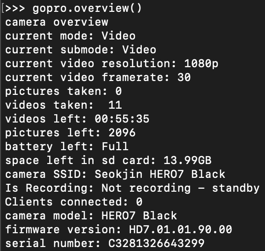 overview()를 이용하여 현재 연결된 고프로의 간단한 개요를 아래 사진과 같이 확인할 수 있다.