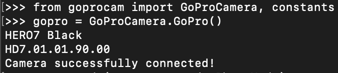 노트북을 고프로의 와이파이에 연결한 뒤 객체를 생성하면 아래 그림과 같이 연결되었다는 메시지가 나온다.