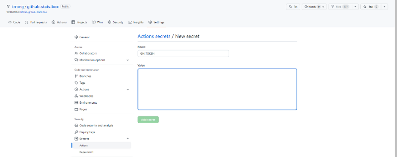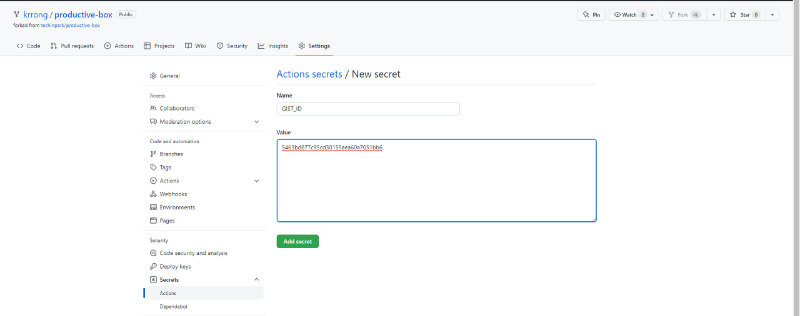 3에서 했던 것 처럼 시크릿을 생성해준다. 다만 이번에는 이름을 GIST_ID로, value를 4에서 메모장에 복사해둔 값으로 만든다. 그리고 역시 Add Seceret!