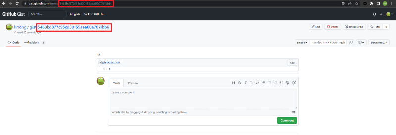 gist id가 필요한데 아까 만들었던 gist로 들어가면 빨간색으로 표시된 박스에 있는 값을 메모장에 복사해두도록 하자.