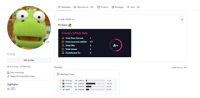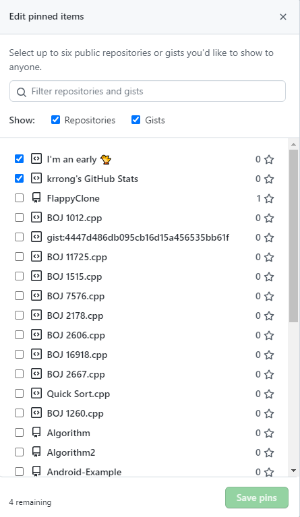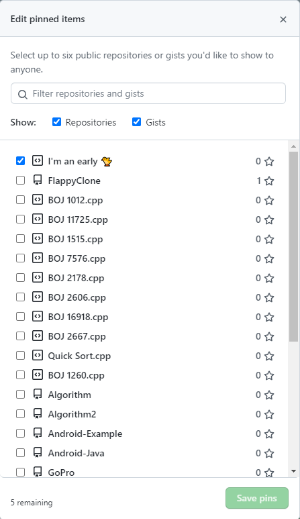 원래는 Readme 파일을 꾸미려고 했는데 하다보니 Pinned Repo에 더 집중된 느낌이다. 나중에 프로필을 더 꾸미게 되는 일이 생기면 그 때 이어서 정리하도록 해야겠다.