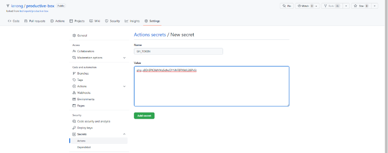 이름은 GH_TOKEN으로 하고, value는 아까 메모장으로 옮겨둔 토큰을 입력하자.