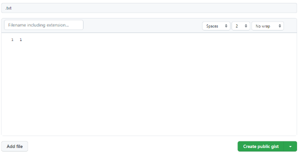 제목과 내용은 나중에 수정할 수 있기 때문에 아무렇게나 적어도 상관없다. 나는 제목을 .txt 내용을 1로만 적어주었다. 여기서 gist를 생성할 때 secret이 아닌 public으로 만들어줘야 하는 것에 주의하자.