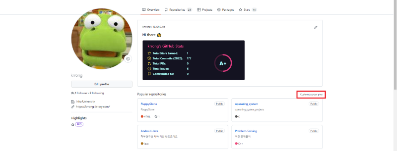 README가 나오는 부분 밑에 보면 내 repository들을 핀으로 지정해서 미리보기처럼 보여줄 수 있는 공간이 있다.