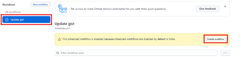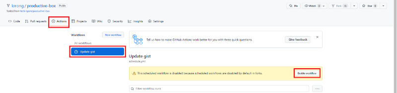 포크한 레파지토리에서 [Actions] → [Update gist] → [Enable workflow]를 클릭해준다.