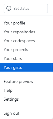 깃허브에 로그인 하고 우측 상단에 있는 본인의 프로필을 클릭한 뒤 [Your Gists]로 들어간다.