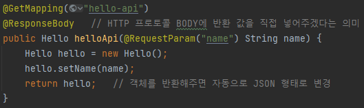 @ResponseBody어노테이션을 보고 HTTP 응답에 바로 데이터를 넘기는 방식으로 동작, HttpMessageConverter가 동작(없으면 viewResolver에게 던져줌)- 메소드가 문자를 반환하는 경우 바로 데이터를 넘겨줄 수 있지만 객체를 반환하는 경우 JSON으로 변경하여 데이터를 넘겨준다.