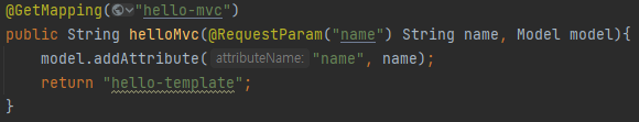 - 메서드의 반환 값은 "hello-template"이고 모델에는 spring이 들어있다.