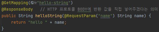 @ResponseBody어노테이션은 스프링이 뷰 리졸버를 사용하지 않도록 하고 HTTP의 BODY에 문자 내용을 직접 반환하도록 한다. 때문에 웹 브라우저에서 localhost:8080/hello-string?name=spring으로 접근하면 "hello spring"을 얻을 수 있다.