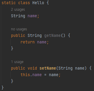 앞의 메서드에서는 문자를 반환하였지만 이번에는 객체를 반환하는 예를 보자. 아래와 같은 Hello 객체를 만들어주자. 간편하게 HelloController 내부에 static class로 만들었다.