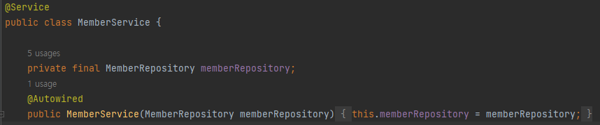 - memberService는 memberRepository가 필요하다. 그러기 위해 memberService에서 @Autowired를 어노테이션을 통해 스프링 컨테이너가 관리하고 있는 memberRepository를 가져와 사용할 수 있도록 하는 것이다.