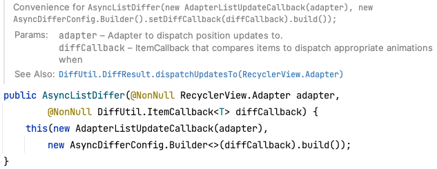 Adapter와 DiffUitil.ItemCallback을 인자로 받아 DiffUtil을 백그라운드 스레드에서 수행하고 DiffResult를 가져와 메인 스레드에서 RecyclerView에 적용한다.